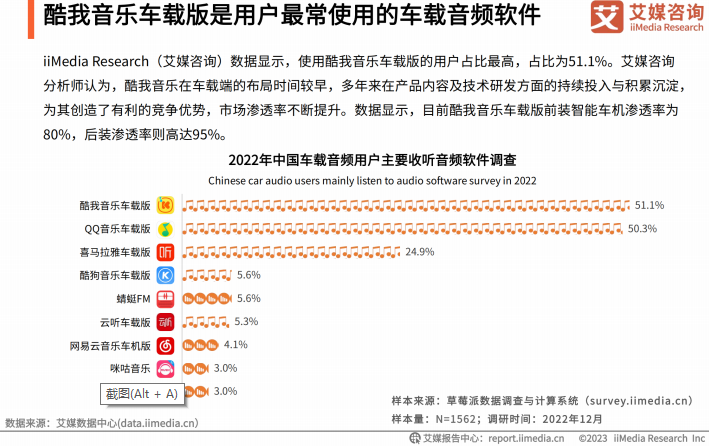 艾媒咨询《中国车载音频行业发展年度研究报告》对2022年中国车载音频软件用户满意度进行全面调查,调查显示,在音质、音效、产品体验、功能满意度等各项评价维度,酷我音乐车载版、QQ音乐领先市场。